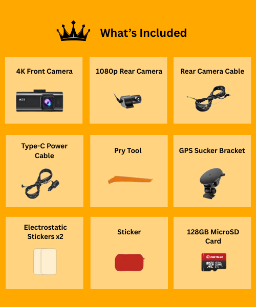 This bundle includes everything you need for a complete, professional dashcam setup: